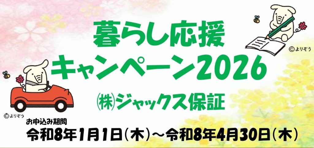 暮らし応援キャンペーン2026「ローン」! 2026年1月1日(水)~2026年4月30日(木)までマイカーローン、教育ローン、(証書型・カード型)の特別金利実施中!詳しくはチラシまたは支店窓口へお問い合わせください。 ★仮申し込みはこちらから