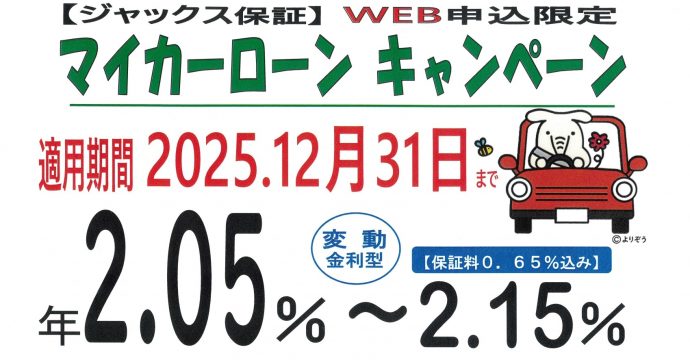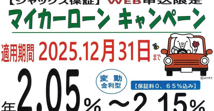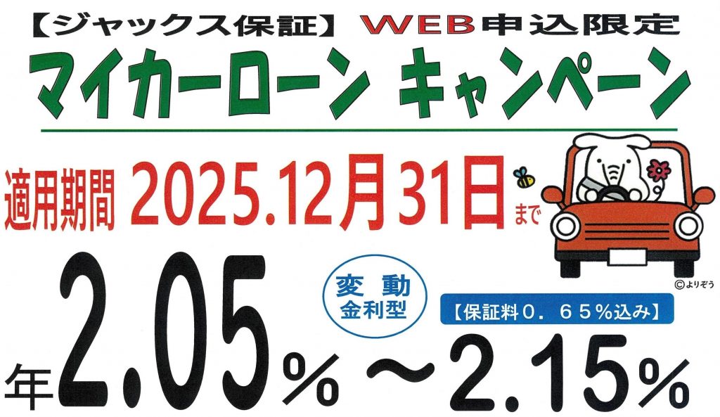 ★ジャックス保証WEB申込限定★ 期間中に申込された方は、マイカーローン年2.05%~2.15%(保証料込)の金利が適用となります。ただし、金利適用条件があります。