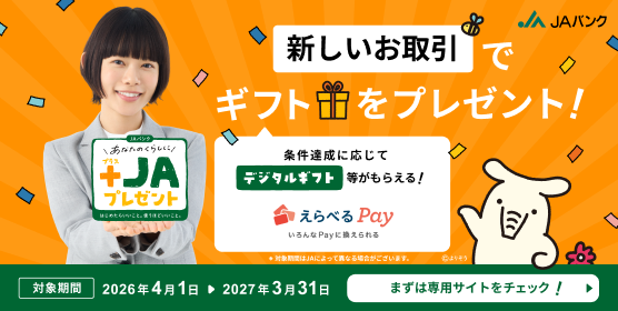 ★JAカードご入会サンクスプレゼント★JAカードのご入会とご利用で最大12,000円相当のポイントをプレゼント致します!!詳細は、バナーをクリック!!