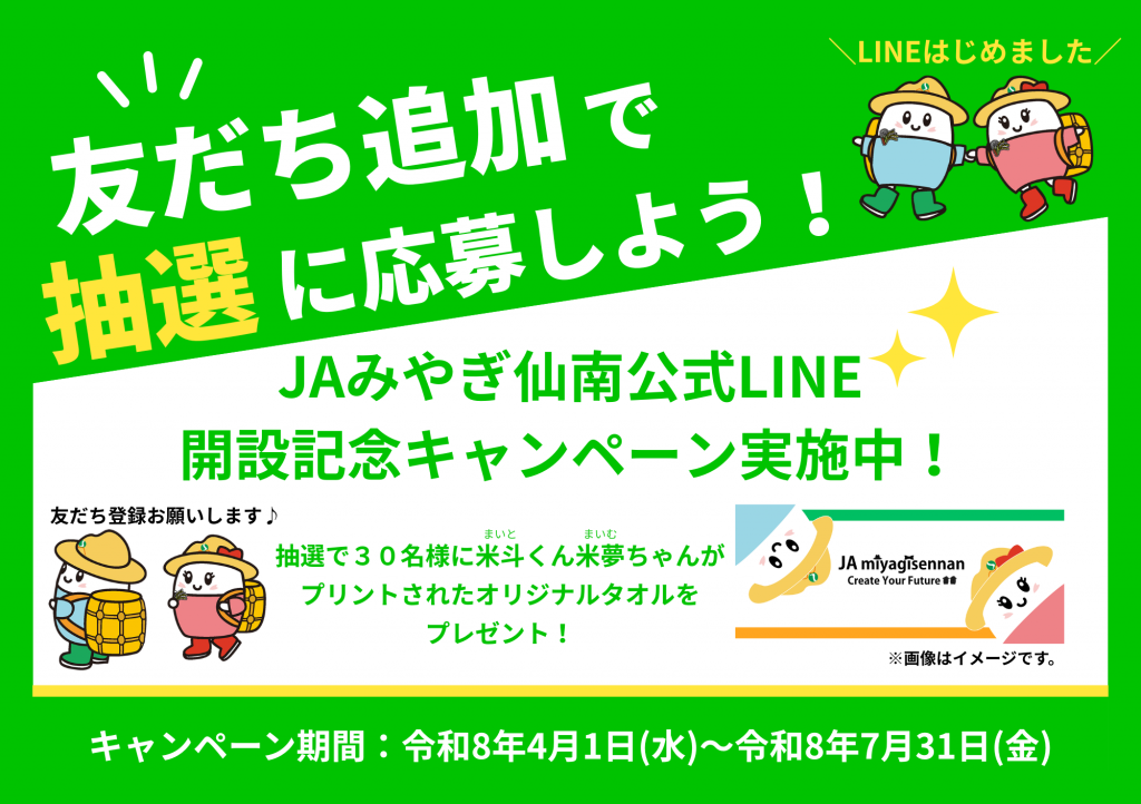 キャンペーン期間中に友だち追加いただいた方へ抽選で、JAみやぎ仙南イメージキャラクターの米斗くん米夢ちゃんがプリントされたオリジナルタオルを30名様にプレゼント✨友だち追加すると応募URLがメッセージ配信されますので、必要事項をご入力の上ご応募ください。